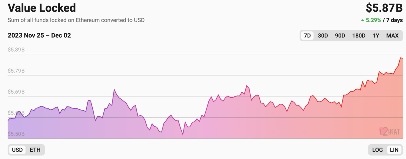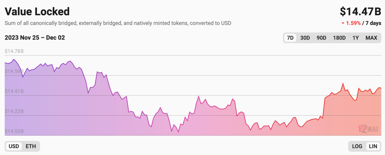 Durante la semana pasada, el valor total bloqueado en L2 disminuyo de $14.76B hasta $14.47B USD al día de hoy, es decir un decremento del 1.59% durante la semana 📉.